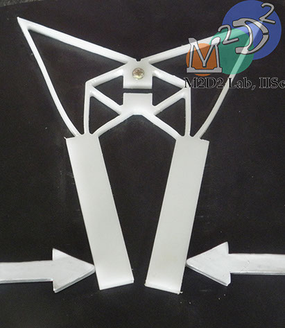 This is a dual-purpose compliant mechanism in which either the handles can be moved with only slight motion of the blocks in the middle on the right; or bringing the handles together creates a large force on an object placed between the blocks on the right in the middle. Thus, it is a Displacement-amplifying Compliant Mechanism (DaCM) and a Force-amplifying Compliant Mechanism (FaCM).