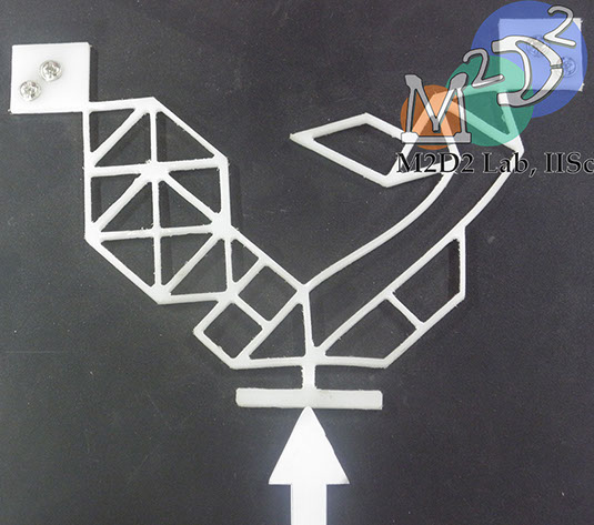 This is the first Displacement-amplifying Compliant Mechanism (DaCM) before this acronym was coined. It was obtained using topology optimization. Its asymmetric design is intriguing. When we press the flat bar at the bottom, the top-middle points moves with amplified (7X) motion. It was later modified for 50X and 100X amplification and was used in multiple applications including a tissue-cutting device.